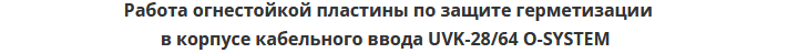 Огнезащитная терморасширяющаяся пластина (мембрана) в составе кабельного ввода серии UVK обеспечивает огнестойкость изделия IET15 в месте ввода, что достаточно для не несущих стен и конструкций для блочно-модульных зданий, относящихся к III-ей (III-а) степени огнестойкости согласно Федеральному закону от 22-го июля 2008 г. № 123-ФЗ "Технический регламент о требованиях пожарной безопасности". Применение негорючей минеральной ваты в месте ввода позволяет увеличить предел огнестойкости до IET60.